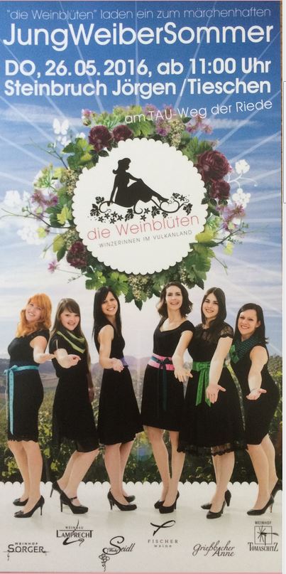 Zu einer ganz besonderen Zeit im Jahr tut sich im Steinbruch Jörgen bei Tieschen frühsommerliche Atmosphäre auf. Die Weinblüten- Winzerinnen im Vulkanland- laden zum JungWeiberSommer und kredenzen ihre feinen Weine zusammen mit kulinarischen Köstlichkeiten aus ihrer Heimat. Am 26. Mai 2016 ab 11 Uhr